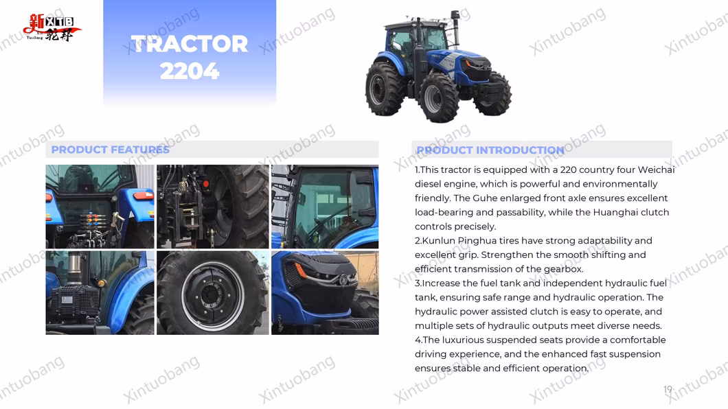 Il motore National IV Weichai (P6) vanta un robusto motore diesel da 220 cavalli, abbinato all'assale anteriore ingrandito Guhe per una maggiore resistenza. Potenziati dalla frizione Huanghai, i pneumatici Kunlun Pinghua (20.8-38/16.9-28) garantiscono una trazione ottimale. Il cambio rinforzato TS16+16 e il serbatoio del carburante più grande garantiscono un funzionamento prolungato. Un serbatoio del combustibile idraulico indipendente e il servocomando idraulico della frizione offrono un controllo di precisione. Quattro uscite idrauliche soddisfano diverse esigenze, mentre i lussuosi sedili a tre livelli migliorano il comfort. Le imbottiture a sospensione rapida sono rinforzate per garantire affidabilità. La presa di forza a doppia velocità 540/1000 e la lussuosa cabina a quattro montanti offrono versatilità e sono dotate di telecamere di guida anteriori e posteriori. Ulteriori caratteristiche includono un frigorifero per auto, un distributore di acqua, un contrappeso posteriore a tre strati (60 KG) e un contrappeso anteriore di 74 pezzi ciascuno del peso di 15. Con la navigazione Sinan e il GPS, la navigazione è perfetta.