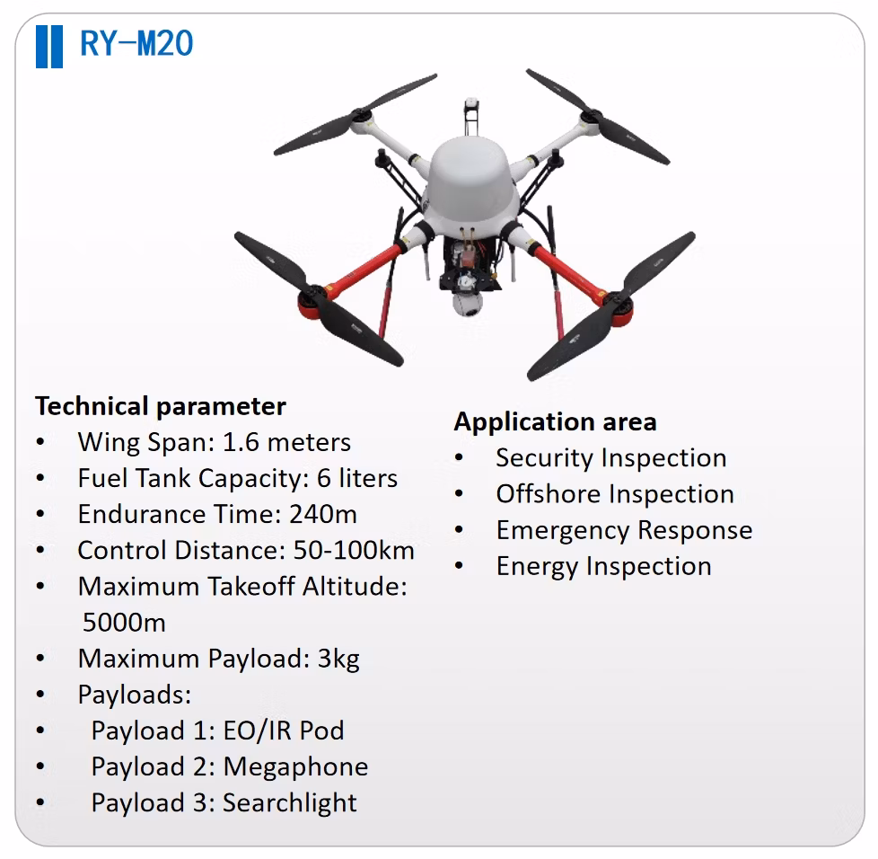Presentazione del drone verticale di decollo e atterraggio RY-V10, un'esclusiva tecnologia di rilevamento aereo "leggera, facile da usare e ad alta efficienza". Sfrutta la potenza di più algoritmi di fusione dei sensori, garantendo prestazioni di volo superiori e garantendo al contempo la massima sicurezza di volo.